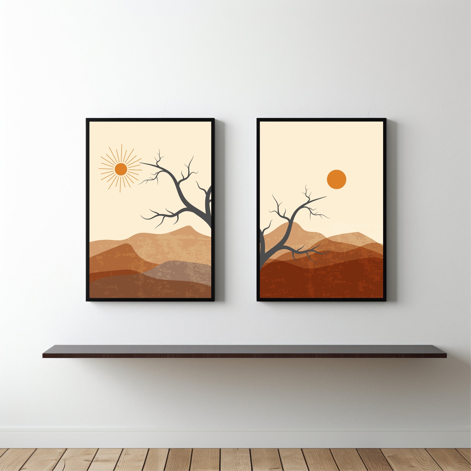 Capture the calm beauty of the desert with the Desert Horizon Duo Wall Frame Set. Featuring abstract mountain layers and bare tree silhouettes in warm earthy tones, this set perfectly balances simplicity and depth. The golden sun and subtle textures bring a cozy, grounded aesthetic β ideal for adding warmth and character to your living room, bedroom, or workspace.