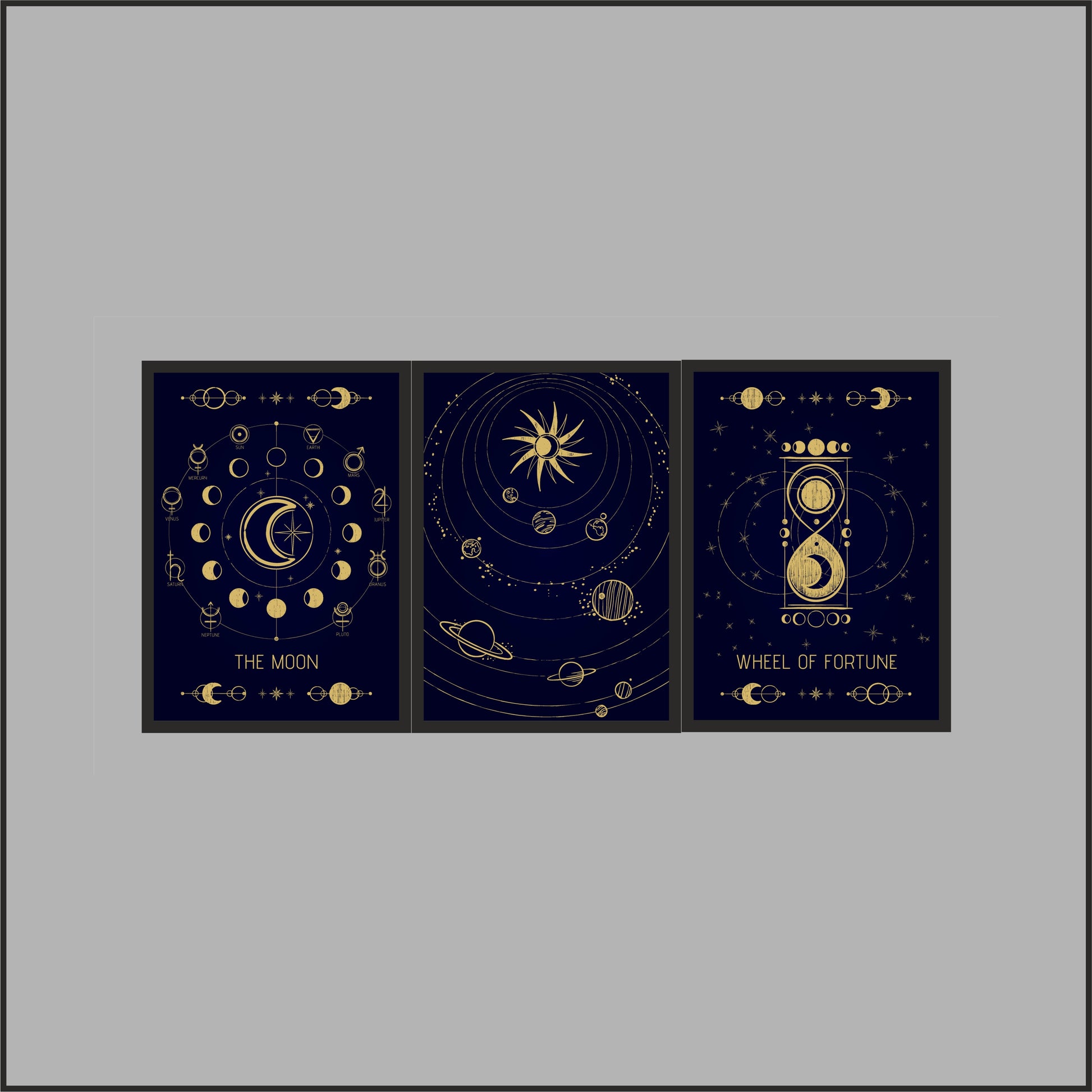 Featuring The Moon, The Sun, and The Wheel of Fortune, each frame is crafted with intricate golden detailing on a deep midnight-blue backdrop — symbolizing destiny, balance, and universal harmony.